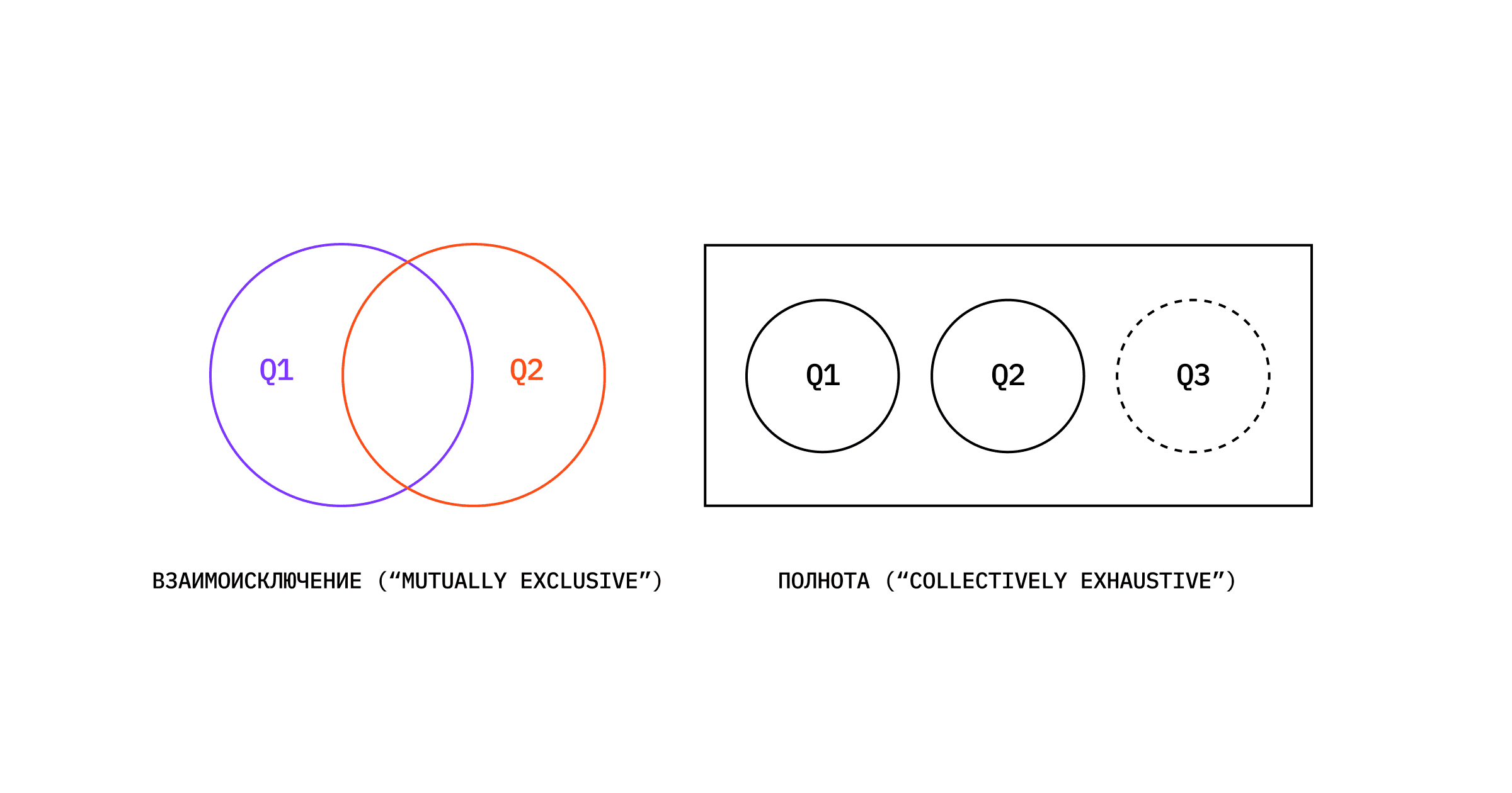 Исследовательские вопросы это то, что мы хотим узнать. Например: «Как пользователи понимают, что такое рекомендации в музыке?», а не вопрос к пользователю.Принцип MECE помогает проверить, охватывают ли вопросы и гипотезы всю важную картину в контексте вашей бизнес-задачи — без пересечений и пробелов.